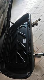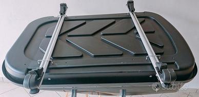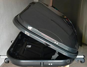 Vendo box tetto per auto pari al nuovo, grigio scuro metallizzato, Baule da tetto aerodinamico per auto, Montaggio facile, resistenza all'aria, acqua e sicuro per viaggiare, dimensione 149 cm x 94 cm x 42 cm dì altezza Max - portata di 420 litri peso 14 kg senza barre porta tutto (che sono a parte) portata Max 50 kg, certificato TUV, provvisto di chiusura laterale a chiave più una chiusura sul davanti per evitare che si apra con la forza del vento (soprattutto in autostrada) il baule lo vendo a 150 € ed è corredato di 2 chiavi, se invece siete interessati anche alle barre porta tutto che vedete in foto sono in vendita a 50 € anche queste sono certificate TUV e hanno una portata Max che va dai 75 kg ai 90 kg e sono corredate anche queste di 2 chiavi di sicurezza.