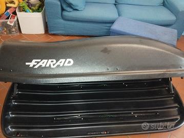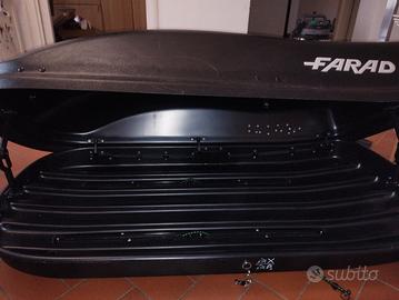Vendo Box tetto auto della Farad praticamente nuovo usato solo per due volte, tenuto in perfette condizioni,le misure sono: lunghezza 1.60, larghezza 80 cm,alto 40 cm, capacità 400 litri,peso box 13 Kg,portata massima 75 kg.