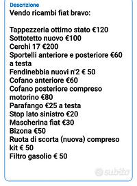 Vendo ricambi fiat bravo anno 2009 Nelle foto c'è la descrizione dei ricambi con i prezzi