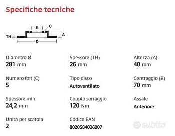 Come da descrizione, causa errato acquisto (la mia 500x monta i dischi da 305mm), vendo nr. 2 dischi freno anteriori BREMBO, mod. PRIME immacolati, mai montati perché palesemente non idonei al mio veicolo. I dischi sono ancora nella loro scatola originale. Visto il peso (circa 16 Kg), preferirei il ritiro a mano, altrimenti le spese di spedizione andranno a gravare sull'acquirente. Allego una lista di veicoli (scaricata direttamente dal sito Brembo) su cui montano i dischi, comprensiva di codici OE, ma verificate tramite carta di circolazione, se montano sulle vostre auto: FIAT 500X (334_) 1.0 (334.AXN1B) 84 kW 114 CV 06/18, (334_) 1.0 (334.AXN1B) 88 kW 120 CV 09/18, (334_) 1.3 D Multijet (334AXH1A) 70 kW 95 CV 11/14, (334_) 1.4 (334AXC1B) 100 kW 136 CV 09/14, (334_) 1.4 (334AXC1B, 334AXC11) 103 kW 140 CV 09/14, (334_) 1.6 D Multijet (334.AXV1B) 96 kW 130 CV 05/21, (334_) 1.6 D Multijet (334AXA1B) 84 kW 114 CV 09/14, (334_) 1.6 D Multijet (334AXA1B, 334AXA11) 88 kW 120 CV 09/14; ALFA ROMEO GIULIETTA (940_) 1.4 BiFuel (940FXA1A, 940FXT1A) 88 kW 120 CV 12/11 - 02/17, (940_) 1.4 TB (940FXA1A, 940FXT1A) 88 kW 120 CV 04/10 - 12/20, (940_) 1.4 TB (940FXN1A, 940FXU1A) 77 kW 105 CV 04/11 - 02/17,(940_) 1.6 JTDM (940FXD1A) 77 kW 105 CV 04/10 - 02/16, (940_) 1.6 JTDM (940FYB11, 940FYB1A, 940FYF11, 940FYF1A) 88 kW 120 CV 02/15 - 12/20,(940_) 1.6 JTDM (940FYE11, 940FYE1A) 85 kW 116 CV 09/15 - 10/18; JEEP RENEGADE SUV (BU, B1, BV) 1.0 T-GDi 88 kW 120 CV 08/18, (BU, B1, BV) 1.0 T-GDi 84 kW 114 CV 08/21, (BU, B1, BV) 1.4 103 kW 140 CV 07/14 - 12/18, (BU, B1, BV) 1.4 100 kW 136 CV 01/16, (BU, B1, BV) 1.6 81 kW 110 CV 07/14 - 09/18, (BU, B1, BV) 1.6 CRD 88 kW 120 CV 07/14, (BU, B1, BV) 1.6 CRD 70 kW 95 CV 11/16, (BU, B1, BV) 1.6 MultiJet 96 kW 130 CV 02/20, (BU, B1, BV) 1.6 MultiJet 84 kW 114 CV 08/22, (BU, B1, BV) 2.0 CRD 4x4 103 kW 140 CV 07/14, (BU, B1) 1.4 103 kW 140 CV 07/14. CODICI OE COMPATIBILI 51806278, 51815312, 519373,51937305, 51937306, 51962485, 52059150.