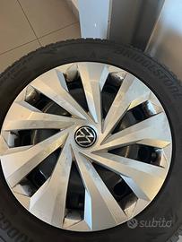 4 pneumatici 4 Stagioni Bridgestone compresi cerchi acciaio e calotte Volkswagen otiginali. Adatti Polo Volkswagen o auto similari con medesima misura pneumatici: Misura 185/85 R15 92T . OTTIMO STATO poiché usati solo 4 mesi senza graffi o segni. Vendo per passaggio ad altra auto con misura diversa.