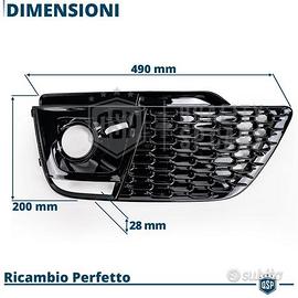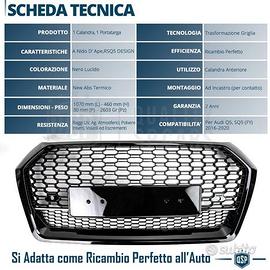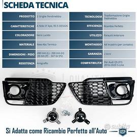 Set 1 CALANDRA ANTERIORE + 2 GRIGLIETTE FENDINEBBIA per AUDI Q5 (FY)S-Line, SQ5 Pre-Restyling (16-20), in Abs Nero, a Nido d' Ape. - Look Rinnovato Rs | Nido d'Ape Ispirazione RS Style. - Ricambio Perfetto | NO Adattamenti o Modifiche. - Rifiniture Estreme | Eccellenza Garantita dei Materiali, Dettagli, Tatto. - Garanzia a Vita | Resistente agli Agenti Atmosferici, Temperature, NOScolorimento. NFO: Rinnova il Look della Tua Audi Q5 S-Line o SQ5 sostituendo alle Griglie diSerie, le Griglie Rs Style nero Lucido, Ispirata alle più Recenti Audi Rs. Mascherine in finitura Nero Lucido, di qualità eccellente nella scelta deimateriali, Rifiniture del Dettaglio, tatto, e colorazione. Si sostituiscono SENZA MODIFICHE alle Griglie Originali e fungono da semplicericambio Tuning delle proprie. COMPATIBILITÀ: - Per AUDI Q5 (FY) S-Line, SQ5 Pre-Restling, 2016-2020 ** ! COMPATIBILE SOLO con paraurti S-Line, NO RSQ5 e Veicoli conTelecamera Frontale ** MONTAGGIO: - Semplicemente da sostituire alle attuali come perfetto Ricambio:COMPATIBLITA' TESTATA AL 100% IL PACCO INCLUDE: - 1 x Calandra Anteriore - 2 x Grigliette Fendinebbia - 1 x Porta Targa Nero Lucido + Predisposizione Sensori di Parcheggio DETTAGLI TECNICI: - Materiale: ABS Termico a pigmentazione - Colore: Nero Lucido - Finitura: Traslucida - Disegno Griglia: RS Design, A Nido d' Ape - Verniciatura: No - Peso Calandra: 2380 Gr - Dimensioni Calandra: 113 Cm (L) - 47 Cm (H) - 3 Cm (P) - Dimensioni Grigliette: 49 cm (L) x 20 cm (H) (c.a.) - Resistenza Schiacciamento: 55Kg - Temperatura di lavoro Compresa tra - 28°C / + 45°C - Confezionamento: Originale PER INFO CONTATTARE AL 3927091031 ANCHE LINEA WhatsApp CONSEGNA: - Effettuiamo Spedizioni 24-48H in TUTTA ITALIA - Ritiro in Sede con Possibilità di Visionare il Prodotto PAGAMENTI: - PayPal - Con Carta - Bonifico Bancario - Alla Consegna con Contrassegno