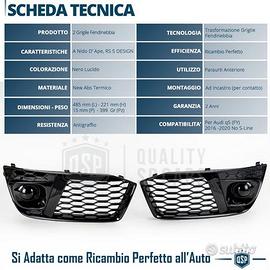 Set 1 CALANDRA ANTERIORE + 2 GRIGLIETTE FENDINEBBIAper AUDI Q5 (FY) Pre-Restyling (16-20), in Abs Nero, a Nido d' Ape. - Look Rinnovato Rs | Nido d'Ape Ispirazione RS Style. - Ricambio Perfetto | NO Adattamenti o Modifiche. - Rifiniture Estreme | Eccellenza Garantita dei Materiali, Dettagli, Tatto. - Garanzia a Vita | Resistente agli Agenti Atmosferici, Temperature, NOScolorimento. NFO: Rinnova il Look della Tua Audi Q5 sostituendo alle Griglie di Serie, le GriglieRs Style nero Lucido, Ispirata alle più Recenti Audi Rs. Mascherine in finitura Nero Lucido, di qualità eccellente nella scelta deimateriali, Rifiniture del Dettaglio, tatto, e colorazione. Si sostituiscono SENZA MODIFICHE alle Griglie Originali e fungono da semplicericambio Tuning delle proprie. COMPATIBILITÀ: - Per AUDI Q5 (FY) Pre-Restling, 2016-2020 ** ! NON COMPATIBILE con versione S-Line, RSQ5 e Veicoli conTelecamera Frontale ** MONTAGGIO: - Semplicemente da sostituire alle attuali come perfetto Ricambio:COMPATIBLITA' TESTATA AL 100% IL PACCO INCLUDE: - 1 x Calandra Anteriore - 2 x Grigliette Fendinebbia - 1 x Porta Targa Nero Lucido + Predisposizione Sensori di Parcheggio DETTAGLI TECNICI: - Materiale: ABS Termico a pigmentazione - Colore: Nero Lucido - Finitura: Traslucida - Disegno Griglia: RS Design, A Nido d' Ape - Verniciatura: No - Dimensioni Calandra: 113 Cm (L) - 47 Cm (H) - 3 Cm (P) - Dimensioni Grigliette: 48,5 cm (L) x 22,1 cm (H) (c.a.) - Resistenza Schiacciamento: 55Kg - Temperatura di lavoro Compresa tra - 28°C / + 45°C - Confezionamento: Originale PER INFO CONTATTARE AL 3927091031 ANCHE LINEA WhatsApp OPPURE VIA E-MAIL: rtautoitalia2018@libero.it CONSEGNA: - Effettuiamo Spedizioni 24-48H in TUTTA ITALIA - Ritiro in Sede con Possibilità di Visionare il Prodotto PAGAMENTI: - PayPal - Con Carta - Bonifico Bancario - Alla Consegna con Contrassegno