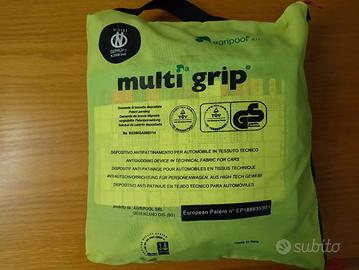 un dispositivo antipattinamento per auto in tessuto tecnico. Montaggio e smontaggio facile e veloce, utilizzo pratico ed efficiente. Omologate TUV-GS. Multigrip è un mezzo d' emergenza che consente una guida confortevole anche in caso di condizioni miste di strada innevata/ghiacciata/asciutta. Comprovata resistenza delle calze anche su strada asciutta per molti km se percorsi a velocitá limitata (40/50 km/h massimo). Le multigrip sono brevettate e realizzate con una tecnica che ne favorisce l' autocentratura sullo pneumatico in poche centinaia di metri. CONFEZIONE DA 2 CALZE