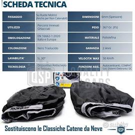 2 Calze da Neve e Ghiaccio Professionali OMOLOGATE per Tesla Model X | Conformi agli Obblighi di Dotazioni Invernali in OGNI STATO EUROPEO - Approvate EN16662-1:2020 | Valide per Osservanze di Obbligo Catene a Bordo in Tutta Europa - Compatibili con Sistemi Elettronici di Sicurezza | Certificato l'aumento di efficienza di ABS, ESP ETS, ASR, DSC... - Montaggio Facile e Veloce | Autocentranti e Maneggevoli, anche in condizioni avverse - Rispetto del Veicolo | Non Graffiano Cerchi e Mantengono un Look Estetico di Spessore - Confortevoli in Uso | Non Provocano Vibrazioni o Rumori COMPATIBILITÀ: - Tesla Model X (dal 2015), con Pneumatici: 255/45 R20 265/35 R22 285/35 R22 L'OMOLOGAZIONE L' Omologazione Europea EN16662-1:2020 è Stampigliata su OGNI SINGOLA Calza e Parifica le CATENE DA NEVE a Queste CALZE DA NEVE come Dispositivo Antiscivolo in TESSUTO. Sono Ufficialmente Riconosciute in ITALIA e Tutta EUROPA, Omologate nel Rispetto delle Normative Europee di Ogni Singolo Stato, Quindi Conformi agli Obblighi di Dotazioni Invernali a Bordo del Veicolo. QUALITA' Queste Calze da Neve rappresentano l'Eccellenza per Veicoli nella percorrenza su Strada in Condizioni di NEVE o GHIACCIO, sono Prodotte in EUROPA, realizzate in Poliolefina, un materiale sintetico intrecciato di Elevata qualità. PER INFO CONTATTARE AL 3927091031 ANCHE LINEA WhatsApp OPPURE VIA E-MAIL: rtautoitalia2018@libero.it CONSEGNA: - Effettuiamo Spedizioni 24-48H in TUTTA ITALIA - Ritiro in Sede con Possibilità di Visionare il Prodotto - Vendiamo solo Articoli Nuovi PAGAMENTI: - PayPal - Con Carta - Bonifico Bancario - Alla Consegna con Contrassegno