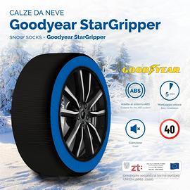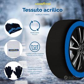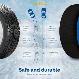 Goodyear Calze da Neve Star Gripper Omologate Italia EN 16662-1:2020 Due Catene da Neve in Tessuto per Auto, Snow Sock Taglia XL, per R14 - R21 (Misure per Pneumatici Dettagliate all'Interno) Prestazioni e sicurezza: Le calze da neve omologate Goodyear Stargripper offrono trazione eccellente su neve e ghiaccio. La trama del tessuto trattiene la neve, creando attrito con il terreno e garantendo una guida sicura fino a 40 km/h. La loro omologazione le rende utilizzabili in tutta Europa come alternativa legale alle catene da neve. Compatibilità universale e facilità d'uso: Queste calze da neve sono disponibili in sei taglie e coprono pneumatici fino a 22 pollici, adatte anche per veicoli con poco spazio tra ruota e passaruota. Il montaggio è semplice: basta collocare la calza sulla ruota motrice, e in pochi minuti si è pronti a partire. Sono compatibili anche con veicoli dotati di ABS. Comfort e silenziosità: Realizzate in tessuto leggero, le calze da neve sono silenziose e non generano vibrazioni durante la guida, migliorando l’esperienza di comfort rispetto alle catene metalliche tradizionali. Riutilizzabili ed ecologiche: Resistenti e lavabili, queste calze da neve sono progettate per durare anni e non sono usa e getta, riducendo così il loro impatto ambientale. Si consiglia di evitare l’uso prolungato su asfalto per preservare il tessuto tecnico e prolungarne la durata. Leggerezza e praticità: L'installazione rapida, la leggerezza e l’inclusione di guanti rendono queste calze da neve omologate una soluzione estremamente pratica. Ideali per chi cerca un metodo veloce e affidabile per affrontare condizioni stradali invernali senza danneggiare cerchioni e pneumatici, rappresentano una scelta ottimale per una guida sicura e comoda su strade innevate o ghiacciate.