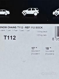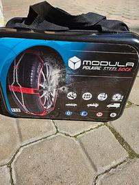 Catene da neve Modula Polaire steel Sock unisce l'efficacia di una tradizionale catena metallica con la semplicità di montaggio di una calza con battistrada in acciaio. Facile da montare e ideale per veicoli con poco spazio tra ruota e organi meccanici. Ingombro interno 7 cm Modula Steel Sock è una catena da neve che combina tutte le caratteristiche di una tradizionale catena da neve metallica con la facilità di montaggio di una calza da neve. Adatte a tutte le auto catenabili Omologate onorm V5117 Italia ed Europa Montaggio semplice ed intuitivo in pochi minuti Indicata per utilizzi sia in neve fresca che su ghiaccio Sono nuove, mai state utilizzate vendo per cambio auto (acquistate per Peugeot 2008) Sono adatte per pneumatici 205/65R17 - 215/60R17 - 195/60R18 - 215/55R18 e per molti modelli di auto tipo: BMW X1 (recenti) BMW Serie 2 Active Tourer MINI Countryman (nuova gen) Volkswagen Taigo versioni sportive Volkswagen T-Roc (Style o R-Line) Jeep Avenger specie (altitude, summit) DS 3 e DS 3 Crossback Ford Puma (STline) Peugeot 2008: vers. GT e Allure Pack Opel Mokka Seat Arona FR o Xperience. Skoda Kamiq Spesso montata come opzione da 18 pollici. Hyundai Kona versioni Hybrid e benzina. Kia Niro Hev Jeep Renegade produzione Melfi Fiat 600, 600e, 500X Alfa Romeo Junior (new modello) Peugeot 208 (new serie) Opel Mokka (new serie), Frontera (2024+) Nissan Qashqai, Juke Mazda CX-30, MX-30 elettrica Citroën C4 e C4 X: verificate la compatibilità con la misura dei vostri pneumatici la custodia che le contiene, in plastica è di piccole dimensioni quindi di minimo ingombro in auto