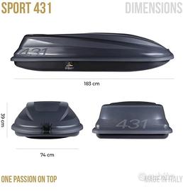 Box colore grigio scuro, universale, adatto a qualsiasi tipo di barra portatutto, con una capacità di 430 litri. Il fondo nero in polipropilene iniettato (PP) presenta inserti interni e punti di fissaggio per evitare che il contenuto scivoli. Il fondo piatto riduce eventuali tubolenze e rumori durante la marcia. Serratura di sicurezza. Sistema di fissaggio standard, pratico, veloce ed adatto per qualsiasi barra portatutto.