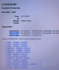 Cambio Revisionato 0km BMW ZF 6 marce Manuale start stop GS6-45DZ Real-OEM part no: 23008609389 Part Replaces: 23007615837 23007635761 23007615841 23008609387 23007599343 23007601542 23007635763 23007635762 23007615838 23007615842 23007637981 23008609383 23007637980 Veicoli Compatibili: 1' F20 (07/2010 02/2015) 11F21 (07/2012 02/2015) 2' F22 (10/2012 _ - 10/20141 3' E91 LCI (09/2009 - 05/2012) 3 F02 ICI (11/2008 -06/20131 3 E93 LCI (11/2008 - 10/20431 31 F30 (03/2011 07/2015) 3' F31 107/2011 07/2015) 3 F34 GT 107/2012- 06/2016) 1 F32 (11/2042 - 02/2016) 1-33 108/2013 -06/20151 4 F3G Gran Coupe 107/2013 5 210 101/2011 06/20131 /09/g044 06/2015) Tel 3338756939