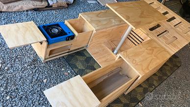 Vendo box da campeggio per qualunque tipo di auto. Comodo e leggero, si può inserire e trasportare nel bagagliaio, e all’occorrenza aprirlo e trasformarlo in letto e cucina. Adatto a tutti i bagagliai, realizzato su misura.