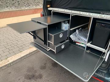 Offre spazio per un refrigeratore a compressore, un fornello, un cassetto per le posate e un piatto, taniche d'acqua, vani portaoggetti e scatole, un carrello, una toilette da campeggio Porta Potti, (NON INCLUSO nell’annuncio).