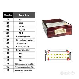 Questa interfaccia è progettata per i veicoli Peugeot e Citroen del 2002-2009 con VAN-bus. Mantiene i controlli del volante; fornisce uscite per freno di stazionamento, ACC, ILL, retromarcia ecc.