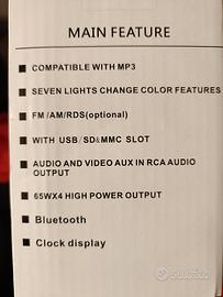 Autoradio acquistata a marzo 2025 per rimodernare lo stereo precedente dell'auto ma smontata adesso per cambio auto. Ancora in garanzia. Orologio, RDS, mp3, 7 colori da poter selezionare x il display, USB, SD e mmc slot, 65Wx4 high Power output, bluetooth, adattatore antenna, adattatore mascherina e sede d'installazione. Funziona perfettamente!