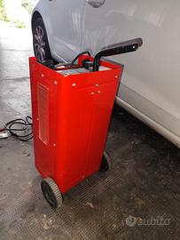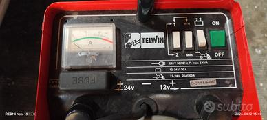 Caricare batterie dotato di ruote e manico per trasporto ,da 12V e 24V (auto, camion, moto, barche, ecc.) Avviare motori a freddo o con batteria scarica (fornisce fino a 250A in 12V e 200A in 24V) Funziona anche come sostegno durante la carica (può mantenere la batteria sotto carico mentre si avvia) Caratteristiche principali (da quello che si vede nella foto): Alimentazione: 220V (potenza max 5 kVA) Uscita: 12V / 24V Corrente di carica: fino a 30A (modalità carica normale) Corrente di avviamento: 200-250A Amperometro analogico con zona START (rossa) per monitorare la corrente durante l’avviamento Selettore 1-2 (probabilmente velocità di carica o modalità) Interruttore MIN/MAX Fusibili di protezione 2x80A Morsetti per batteria ben dimensionati (quelli neri in basso) Marca: TELWIN (azienda italiana leader nel settore saldatrici e caricabatterie).