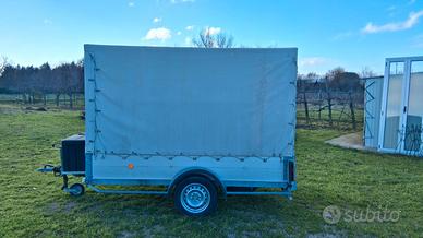 Vendo carrello rimorchio per auto. Usato per trasporto moto, centina smontabile, ruota di scorta, luce interna, doppia sponda, omologato trasporto cose. Dimensioni interne 255x130xH165 Prezzo 3500