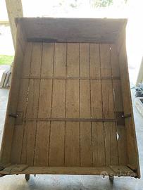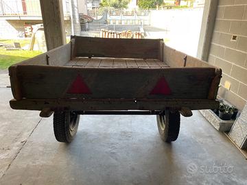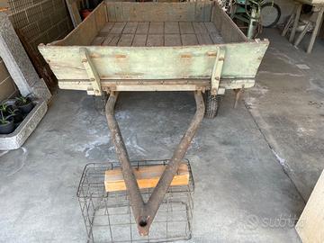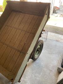 Vecchio carretto agricolo, con due ruote, ribaltabile. Struttura in legno, sponde rimovibili. Non omologato. Misura cassone carro: 180x140cm Altezza sponde: 23cm Lunghezza totale, timone incluso, circa 280cm Misure gomme (chiodate): 165x380