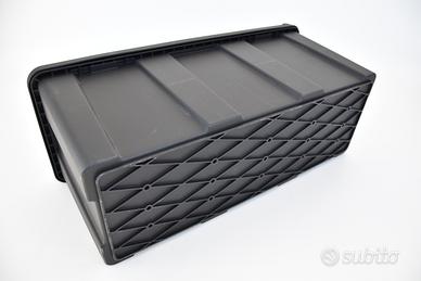 Cassetta di stoccaggio in plastica nera con serratura a chiave. Riponi e porta con te gli oggetti e gli accessori che ti servono: cinghie, chiavi e piccoli attrezzi. Pratica e utile cassetta porta oggetti in robusta plastica nera rinforzata da applicare a carrelli per auto e rimorchi.