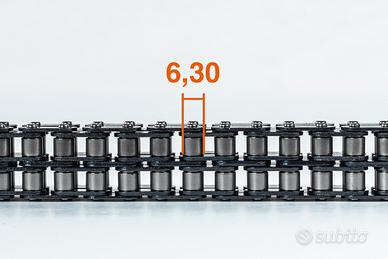 Kit molto resistente con catena a maglia grossa e rulli da 6,3mm. Peso corona 520g.