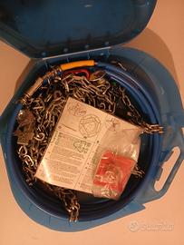 vendesi come da foto catene auto mai usate. la scatola è sporca ma le catene non sono mai state montate. presenti anche istruzioni e anelli di congiunzione per riparazioni come da foto. misure compatibili in ultima immagine