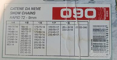 Coppia di catene da neve Bottari Rapid T2, modello 090, con maglia da 9mm. Mai utilizzate e omologate. misure pneumatici: 14": 195/75-14 195-14 195/80-14 205/70-14 215/65-14 225/60-14 245/40-14 600-14 15": 180-15 180/80-15 185/75-15 185-15 185/80-15 195/70-15 205/65-15 215/60-15 225/50-15 225/55-15 235/45-15 255/45-15 16": 175/75-16 175-16 175/80-16 185/70-16 195/60-16 195/65-16 205/55-16 215/50-16 225/45-16 17": 195/55-17 205/50-17 215/45-17 235/40-17 18": 205/40-18 225/35-18 220/55-390 - Montaggio rapido con cavo flessibile e tensionatore autobloccante. - Maglia compatta a sezione D da 9mm. - Cavo laterale interno ricoperto in PVC. - Aggancio esterno con tensionatore autobloccante. - Massima sicurezza e minori vibrazioni.