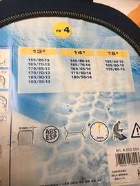 Vendo catene a rombo per auto per una aderenza ottimale, mai usate. Utilizzabili su raggi ruota R13, R14 ed R15. Il profilo pneumatico riduce a 9 mm per preservare l' integrità dei sensori ABS e ESP. Montaggio semplice senza spostare o sollevare il veicolo. Anello ultra resistente.