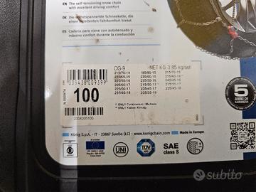 Vendo catene da neve König CG-9 (Gruppo 100), top di gamma per auto, assolutamente NUOVE e MAI USATE. Le vendo per cambio auto. Come visibile dalle foto, la confezione originale è stata aperta solo per verificare il contenuto. Le catene sono lucide, pulite e complete di tutto il kit accessori (maglie di ricambio, guanti, tappetini di montaggio e istruzioni) ancora sigillato nel suo sacchetto trasparente. ❄️ Principali Vantaggi (Autotensionanti): Tecnologia Autotensionante König: Dimentica la scomodità di fermarti dopo pochi metri per stringere le catene. Grazie al sistema di tensionamento automatico brevettato, si stringono da sole mentre guidi, garantendo la massima sicurezza e facilità d'uso. Ingombro Ridotto (9mm): Compatibili con la maggior parte dei veicoli moderni che hanno poco spazio tra la gomma e le parti meccaniche del passaruota. Protezione per Cerchi in Lega: Include elementi in nylon colorato da applicare ai punti di aggancio per proteggere i tuoi cerchi in lega dai graffi durante l'uso. Omologazioni di Legge: Certificate UNI, TÜV e Ö-Norm (pienamente a norma di legge e valide per l'obbligo di catene a bordo). 📏 Compatibilità (Gruppo 100): Controlla la misura dei tuoi pneumatici, queste catene montano su: 14": 215/70-14 15": 195/80-15, 215/70-15, 225/65-15, 235/60-15 16": 215/60-16, 225/55-16, 235/50-16, 245/45-16 17": 215/50-17, 215/55-17, 225/50-17, 235/45-17, 245/40-17 18": 225/45-18, 235/40-18 19": 235/35-19 Dettagli vendita: Stato: Nuove, mai usate. Kit accessori sigillato. Prezzo: 75€ (Prezzo competitivo rispetto al nuovo in negozio, dove costano 120-140€). Consegna: Ritiro a mano a Bolzano o spedizione veloce e sicura tramite TuttoSubito.