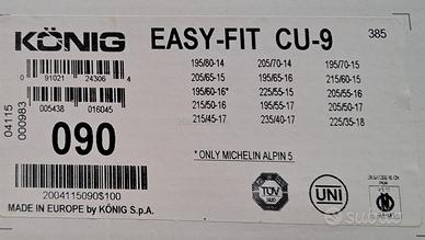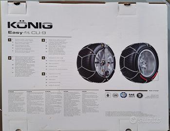 Catene da neve a montaggio ultra rapido in pochi secondi, anche in condizioni meteo difficili. Montaggio alla portata di tutti, anche per chi non ha manualità. Vedi filmato sul sito König o su Youtube ricercando König Easy-fit CU-9