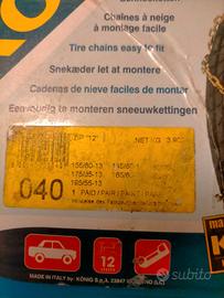 Catene da neve Konig Zip 12 040. Facili da montare. Nuove in scatola ancora sigillata. Confezione originale mai aperta. Dimensione e tipologia del pneumatico come da foto allegata, compatibili con tanti modelli , vedete foto con elenco codici. No cartellino.