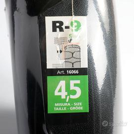 Dimensioni: La confezione specifica la misura "4,5" e una tabella di compatibilità per pneumatici da 14" e 15".