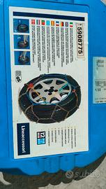Set di catene da neve per auto, modello Lineaccessori. - Spessore maglia 12 mm. - Adatte per pneumatici. - Omologate TUV GS. - Include pratica valigetta. - Montaggio rapido Mod. 5908775 gruppo 50 Codici di riferimento: 165-13, 170-13, 560-13, 600-13, 175/70-13, 185/65-13, 165/70-14, 175/65-14, 185/60-14, 155-14, 135-15, 145-15, 170/65-365, 180/65-340, 190/55-365, 195/45-15 Mai usate come da foto