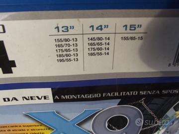 CATENE DA NEVE MARCA CORA MODELLO X9 GRUPPO MISURE VALIDE PER GOMMA DA 13 POLLICI 155/80-13 165/70-13 175/65-13 185/60-13 19555-13 MISURE VALIDE PER GOMMA DA 14 POLLICI 145/80-14 165/65-14 175/60-14 187/55-14 MISURE VALIDE PER GOMMA DA 15 POLLICI 155/65-15 CATENA NUOVA NELLE CONFEZIONE ORIGINALE MAI APERTA