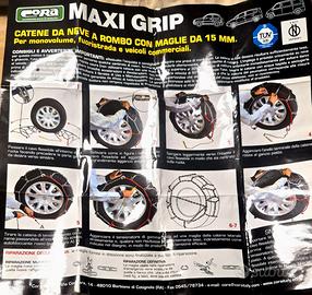 Catene da neve CORA modello Maxi Grip da 15mm, gruppo 117, a rombo con maglie da 15 mm, specifiche per monovolume, fuoristrada e veicoli commerciali leggeri. Montaggio facilitato all'esterno senza spostare o sollevare il veicolo.