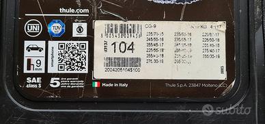 Catene da 9 mm Thule (marca che ha acquisito la König) omologate EN 16662-1. Si montano velocemente perché non serve muovere l'automobile e si tensionano da sole quando si riparte (non serve fermarsi per ritensionarle). Non graffiano i cerchi in lega. Peso inclusa confezione; 4.1 kg.