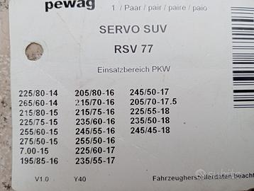 Catene da neve per Suv della Pewag Austria da mm. 13 usate una volta, con auto allineamento e a tensionamento automatico Migliori catene per altroconsumo. Misura che usavo 225/60-17 allego elenco misure pneumatici