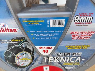 Catene da neve Rhütten modello Teknica, misura 40. Maglia a rombo da 9mm per un ingombro ridotto e guida confortevole. Montaggio facile e veloce senza spostare l'auto. Omologate a norma ONORM V 5117. Consulta la tabella nelle foto per la compatibilità pneumatici (es. 13", 14", 15"). Nuove mai aperto