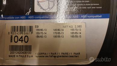 Vendo, causa cambio macchina, catene da neve THULE E9, gruppo 040 (per misure pneumatici vedere foto), maglia 9 mm, NUOVE, mai montate.