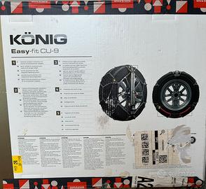 Nuove ancora confezionate, borsa , sono rapide e facili da montare ; disponibili subito . Mai usate ; ma in emergenza sono le uniche da montare senza problemi; non rovinano i cerchi in lega . Per esperienza dico che in caso di ghiaccio o neve ghiacciata o spunti in salita i pneumatici termici non sono sufficienti!