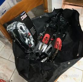 Catene da neve adatte a qualsiasi tipo di auto, comprese quelle che non accettano catene di tipo tradizionale a causa dello spazio ridotto tra pneumatici ed organi interni della ruota. UNIVERSALI: il montaggio avviene solo sulla parte esterna degli pneumatici senza interferire con gli organi meccanici interni della ruota; le catene Trak sono pertanto adatte anche per le vetture definite non catenabili dalle case automobilistiche. FACILI DA MONTARE: è sufficiente posizionare la catena su una parte del pneumatico; sfruttando l'avanzamento dell'automobile, Trak sale da sola sulla ruota senza essere toccata. Il fissaggio inoltre avviene solo sulla parte esterna delle ruote motrici per cui non sono necessarie difficoltose operazioni per allacciare la catena sulla parte interna della ruota. MASSIMA ADERENZA: Trak si autoregola; ciò consente una perfetta aderenza della catena al battistrada del pneumatico che si traduce in una guida sicura e silenziosa. ULTRA ROBUSTE: maglie in acciaio altolegato a sezione tonda di diametro 4 mm., cementate e zincate elettroliticamente; traversini in acciaio cementato e zincato; barre rinforzanti in acciaio al boro e tenditore autotensionante in mescola. CONFORMI ALLE NORMATIVE VIGENTI: le catene TRAK sono certificate TUV, CUNA NC 178-01, ON V 5117 e L 200. Adatte per le seguenti misure di pneumatico: 13" (195/70-13; 225/60-13), 14" (185/65-14; 205/60-14; 225/55-14), 15" (195/55-15; 215/50-15), 16" (175/55-16; 185/50-16; 195/50-16), 17" (205/40-17; 245/35-17)