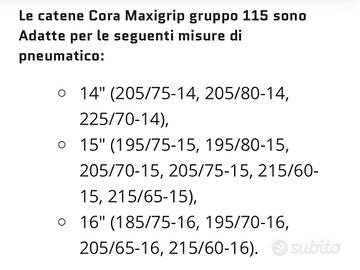 Catene da neve Cora MaxiGrip a rombo con maglia da 15 mm; per monovolume, veicoli 4x4 e veicoli commerciali leggeri. Adatte per le misure: 14” (195/75-14, 195/80-14, 205/70-14, 215/70-14, 235/60-14, 670-14) 15” (185/80-15, 195/65-15, 195/70-15, 205/65-15) 16” (175/75-16, 175/80-16, 195/65-16, 205/55-16, 205/60-16) Nuove, mai utilizzate.