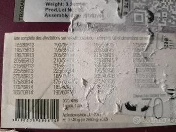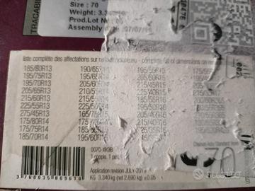 catene da neve Polaire XK9 taglia 70 Le catene da neve sono dispositivi di sicurezza che si applicano alle ruote motrici di un veicolo per aumentare l'aderenza su strade innevate o ghiacciate. Queste catene sono un'alternativa agli pneumatici invernali e sono obbligatorie a bordo in Italia durante il periodo invernale in specifici tratti stradali, solitamente dal 15 novembre al 15 aprile. Il modello XK9 di Polaire è descritto come un sistema a tensionamento automatico ("Automatic tensioning") e compatibile con veicoli dotati di sistemi ABS ed ESP. Con le catene da neve montate, la velocità massima consentita è di 50 km/h, come indicato dal Codice della Strada. misure in foto mai aperto