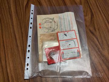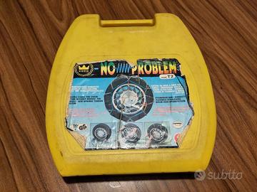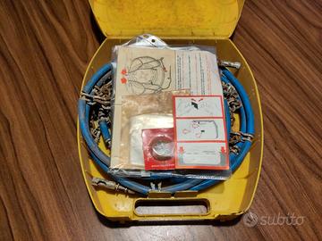 Catene a cavo flessibile che consentono il montaggio senza spostare l'auto. Le catene sono state usate 1 volta, ottime condizioni anche se un po' arruginite (vedere foto). Inclusi pezzi di ricambio originali, adesivo in velcro ancora da usare, istruzioni originali.