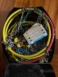 Vendo catene da neve a rombo con maglie da 9 mm, realizzate con acciaio trattato di altissima qualità. Grazie all'ingombro ridotto, possono essere montate anche quando lo spazio tra pneumatici ed organi meccanici interni è molto limitato. Il disegno a rombo migliora l'aderenza al fondo, permettendo di ridurre gli spazi di frenata e garantendo un miglior sfruttamento del dispositivo anti-bloccaggio nelle auto dotate di ABS. Lo spessore ridotto riduce sensibilmente sobbalzi, vibrazioni e rumorosità, aumentando il comfort di guida e la durata degli ammortizzatori. Montaggio facile e veloce in meno di 3 minuti senza spostare o sollevare l'auto. In pratica valigetta salvaspazio/salvabaule. Conformi alle normative UNI 11313, CUNA NC 178-01, ONORM V5117. Adatte per le seguenti misure di pneumatico: 13" (195/80-13, 205/70-13, 205/75-13, 225/60-13), 14" (185/80-14, 195/70-14, 205/65-14, 215/60-14, 225/55-14), 15" (175/75-15, 185/70-15, 195/65-15, 205/60-15, 225/45-15), 16" (175/70-16, 185/65-16, 195/55-16, 195/60-16, 205/50-16), 17" (205/45-17, 215/40-17, 225/35-17). Catene da neve a rombo con maglie da 9 mm Ideali per le auto moderne con spazio limitato tra ruota, passaruota e dispositivi meccanici/elettronici Lo spessore ridotto riduce sensibilmente sobbalzi, vibrazioni e rumorosità, aumentando il comfort di guida e la durata degli ammortizzatori Montaggio facile e veloce in meno di 3 minuti senza spostare o sollevare l'auto Conformi alle normative UNI 11313, CUNA NC 178-01, ONORM V5117