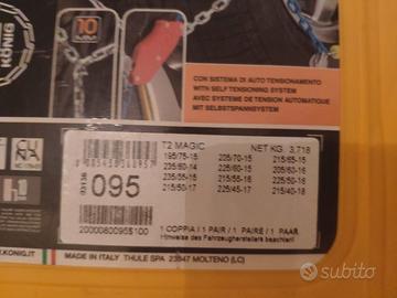 Vendo coppia di catene da neve König T2 Magic, gruppo 095, in ottime condizioni e complete di valigetta rigida originale. Questo modello è uno dei più affidabili sul mercato grazie alla tecnologia Thule/König che garantisce sicurezza e facilità di montaggio. Caratteristiche principali: Sistema Auto-Tensionante: La catena si tensiona automaticamente durante la guida, non occorre fermarsi per stringerla dopo pochi metri. Ingombro 10mm: Spessore ridotto ideale per auto moderne, garantendo comfort e protezione degli organi meccanici. Montaggio Rapido: Ganci e punti di contatto colorati per un'installazione intuitiva anche al buio o sotto la neve. Materiali Premium: Acciaio speciale legato al manganese per una durata superiore. Misure compatibili (fare riferimento all’etichetta).