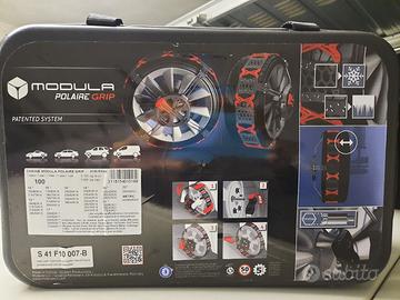catene da neve modula polaire grip 100 MAI UTILIZZATE vendo per cambio auto. ideali per modelli di auto con poco spazio libero intorno alla ruota. si montano su ruote non catenabili, misure come da foto non spedisco