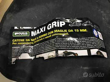 Una coppia di catene neve Maxi Grip, modello GR 121, Maglia rinforzata da 15mm, adatte a SUV, furgoni, fuoristrada (anche auto), nuove, mai montate, misure compatibili in foto. Formula visto e piaciuto. Pagamento bonifico o contanti. Spedisco solo se organizzate voi il corriere.
