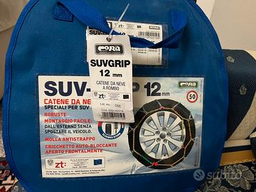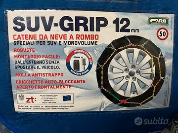 Robuste catene da neve a rombo con maglie da 12 mm, specifiche per SUV e monovolume. Montaggio facilitato all'esterno senza spostare o sollevare il veicolo. Provviste di molla antistrappo e cricchetto auto-bloccante aperto frontalmente. In pratica borsa salvaspazio/salvabaule. Conformi alla normativa ONORM V5117. Adatte per le seguenti misure di pneumatico: 15" (255/70-15, 275/60-15, 840-15, 30x9.5-15), 16" (235/70-16), 17" (255/55-17), 18" (215/60-18, 225/60-18, 255/45-18), 19" (215/50-19, 225/55-19, 235/50-19, 275/40-19), 20" (235/45-20, 255/40-20, 275/35-20).
