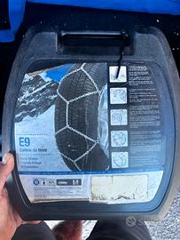 Vendo catene da neve E9, adatte per pneumatici invernali. Il prodotto è compatibile con ABS e indicato per uso su auto È incluso uno schema di montaggio rapido sul lato destro.