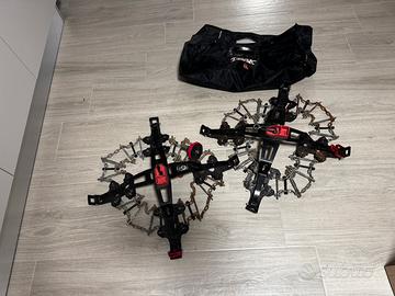 Vendo Catene da neve adatte a qualsiasi tipo di auto, comprese quelle che non accettano catene di tipo tradizionale a causa dello spazio ridotto tra pneumatici ed organi interni della ruota. Particolarmente indicate per le vetture sportive o con assetto ribassato grazie all'ingombro minimo sul battistrada (solo 10 mm). UNIVERSALI: il montaggio avviene solo sulla parte esterna degli pneumatici senza interferire con gli organi meccanici interni della ruota (le catene Trak sono pertanto adatte anche per le vetture definite non catenabili dalle case automobilistiche). FACILI DA MONTARE: è sufficiente posizionare la catena su una parte del pneumatico dopodiché, sfruttando l'avanzamento dell'automobile, Trak sale da sola sulla ruota senza essere toccata. Il fissaggio inoltre avviene solo sulla parte esterna delle ruote motrici per cui non sono necessarie difficoltose operazioni per allacciare la catena sulla parte interna della ruota. MASSIMA ADERENZA: Trak si autoregola, ciò consente una perfetta aderenza della catena al battistrada del pneumatico che si traduce in una guida sicura e silenziosa. ULTRA ROBUSTE: maglie in acciaio altolegato a sezione mezza tonda di diametro 3 mm, con maglie di rinforzo saldate sovrapposte, cementate e zincate elettroliticamente, traversini in acciaio cementato e zincato con nuove barre rinforzanti in acciaio altolegato a sezione ridotta e nuovi tenditori in gomma autotensionanti. CONFORMI ALLE NORMATIVE VIGENTI: le catene TRAK sono certificate TUV, CUNA NC 178-01 e L 200.