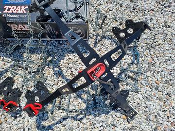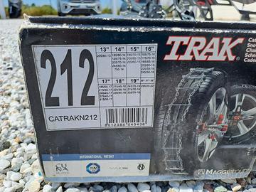 Catene da neve adatte a qualsiasi tipo di auto, comprese quelle che non accettano catene di tipo tradizionale a causa dello spazio ridotto tra pneumatici ed organi interni della ruota. UNIVERSALI: il montaggio avviene solo sulla parte esterna degli pneumatici senza interferire con gli organi meccanici interni della ruota; le catene Trak sono pertanto adatte anche per le vetture definite non catenabili dalle case automobilistiche. FACILI DA MONTARE: è sufficiente posizionare la catena su una parte del pneumatico; sfruttando l'avanzamento dell'automobile, Trak sale da sola sulla ruota senza essere toccata. Il fissaggio inoltre avviene solo sulla parte esterna delle ruote motrici per cui non sono necessarie difficoltose operazioni per allacciare la catena sulla parte interna della ruota. MASSIMA ADERENZA: Trak si autoregola; ciò consente una perfetta aderenza della catena al battistrada del pneumatico che si traduce in una guida sicura e silenziosa. ULTRA ROBUSTE: maglie in acciaio altolegato a sezione tonda di diametro 4 mm., cementate e zincate elettroliticamente; traversini in acciaio cementato e zincato; barre rinforzanti in acciaio al boro e tenditore autotensionante in mescola. CONFORMI ALLE NORMATIVE VIGENTI: le catene TRAK sono certificate TUV, CUNA NC 178-01, ON V 5117 e L 200