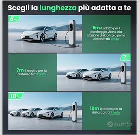 Scegli la lunghezza adatta: 5m è adatto per la distanza tra 1 auto, 7m è adatto per la distanza tra 2 auto e 10m è adatto per la distanza tra 3 auto. Il cavo è dotato di una resistente borsa per il trasporto e di velcro, ideale per riporre i cavi di ricarica dei veicoli elettrici